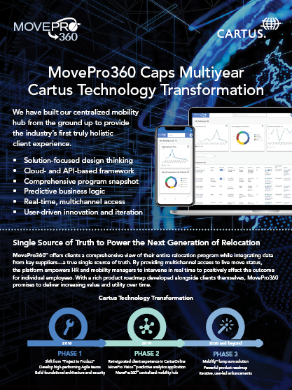 “Cartus technology is at the forefront for us. It is really something that we have focused on for a couple of reasons. First, we want to make sure that we are capturing the data correctly and in real-time to help us. Second, we must tell a story with our data. It’s important for me to have the right data points so that I can put that data together in a story that resonates with my leaders.”
